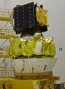 The AMOS 2 satellite is shown mated to its Fregat upper stage, which is covered in gold-colored protective blankets. The integration of AMOS 2 atop the Fregat stage occurred in Starsem's Upper Composite Integration Facility (UCIF) -- a 587-square-meter, high-bay clean room that is located inside the MIK 112 integration building at Baikonur Cosmodrome.