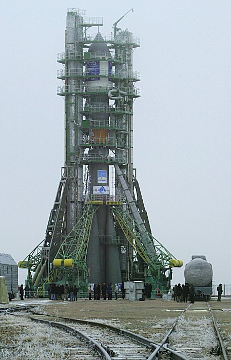 The completed Soyuz/Fregat launch vehicle is shown on Launch Pad #6 after its erection. Rollout of the launcher from the Soyuz assembly/integration building to the launch zone occurred on December 24 at 7:30 a.m. - a morning timing that has been respected since the early days of the Russian space program. Flight ST12 was a joint effort with Arianespace that resulted from the two companies' flexible launcher family policy. The mission's AMOS 2 satellite originally was scheduled for an Ariane 5 launch, but was switched to Soyuz/Fregat in a decision that was made in coordination with the client.